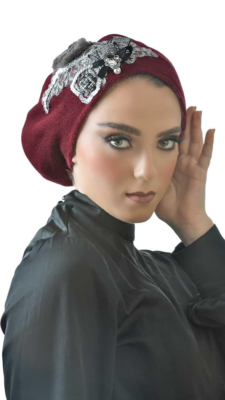 ברט מעוצב בורדו בשילוב תכשיט בגווני אפור וכסף