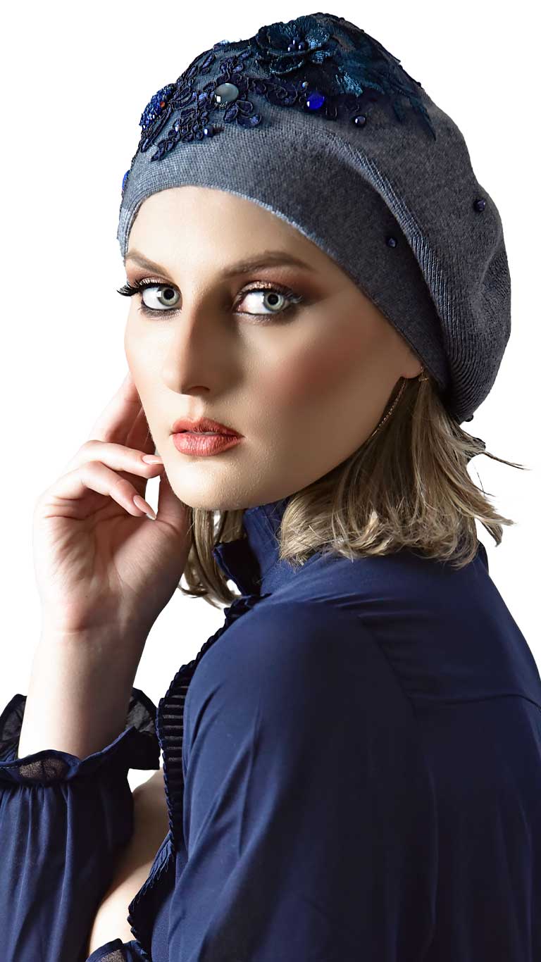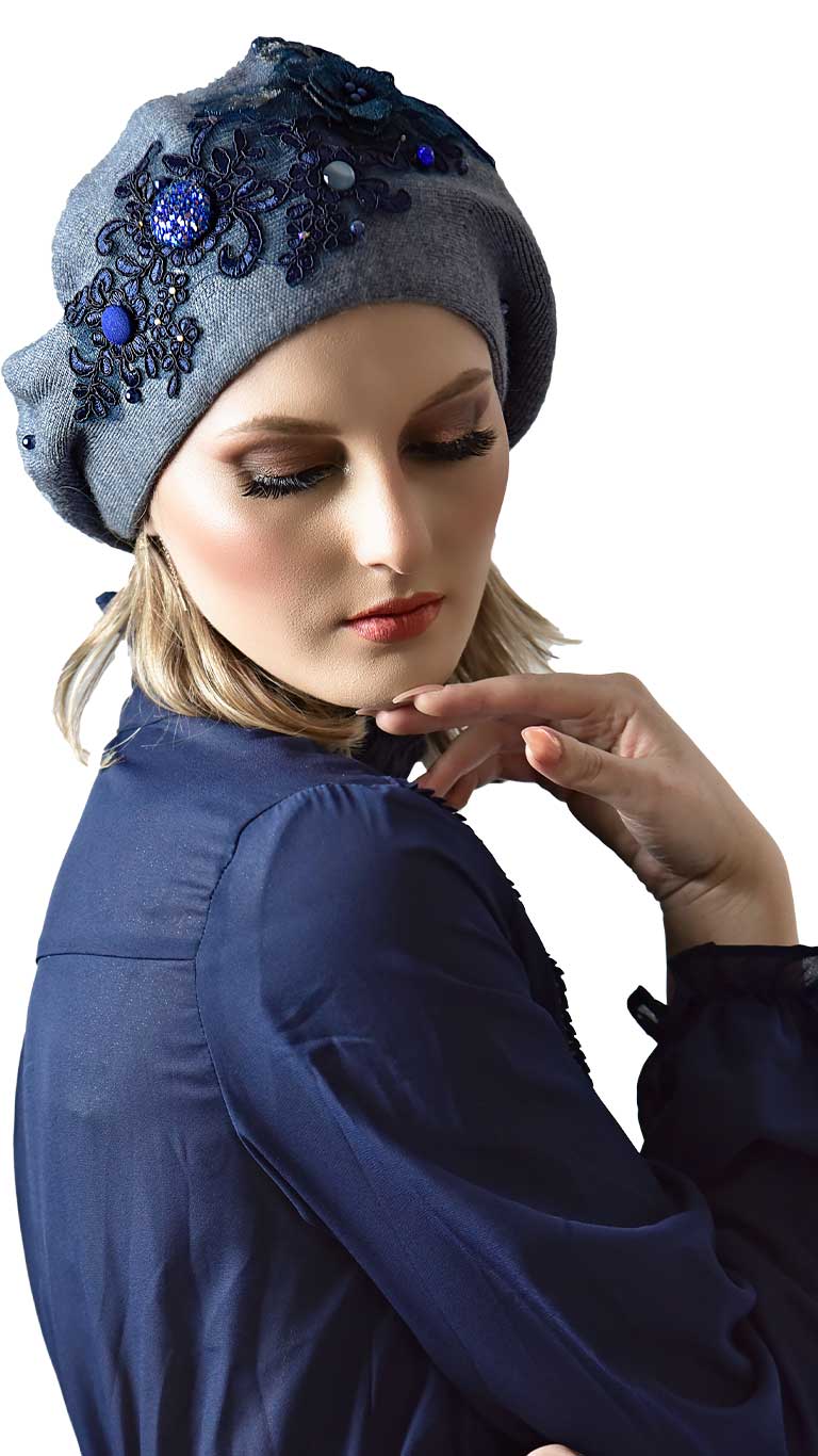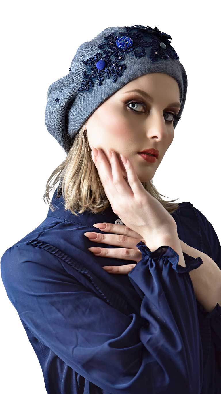 ברט מעוצב צבע ג'ינס פנינים עם תכשיט תחרה בגוון כחול בשיבוץ אבנים