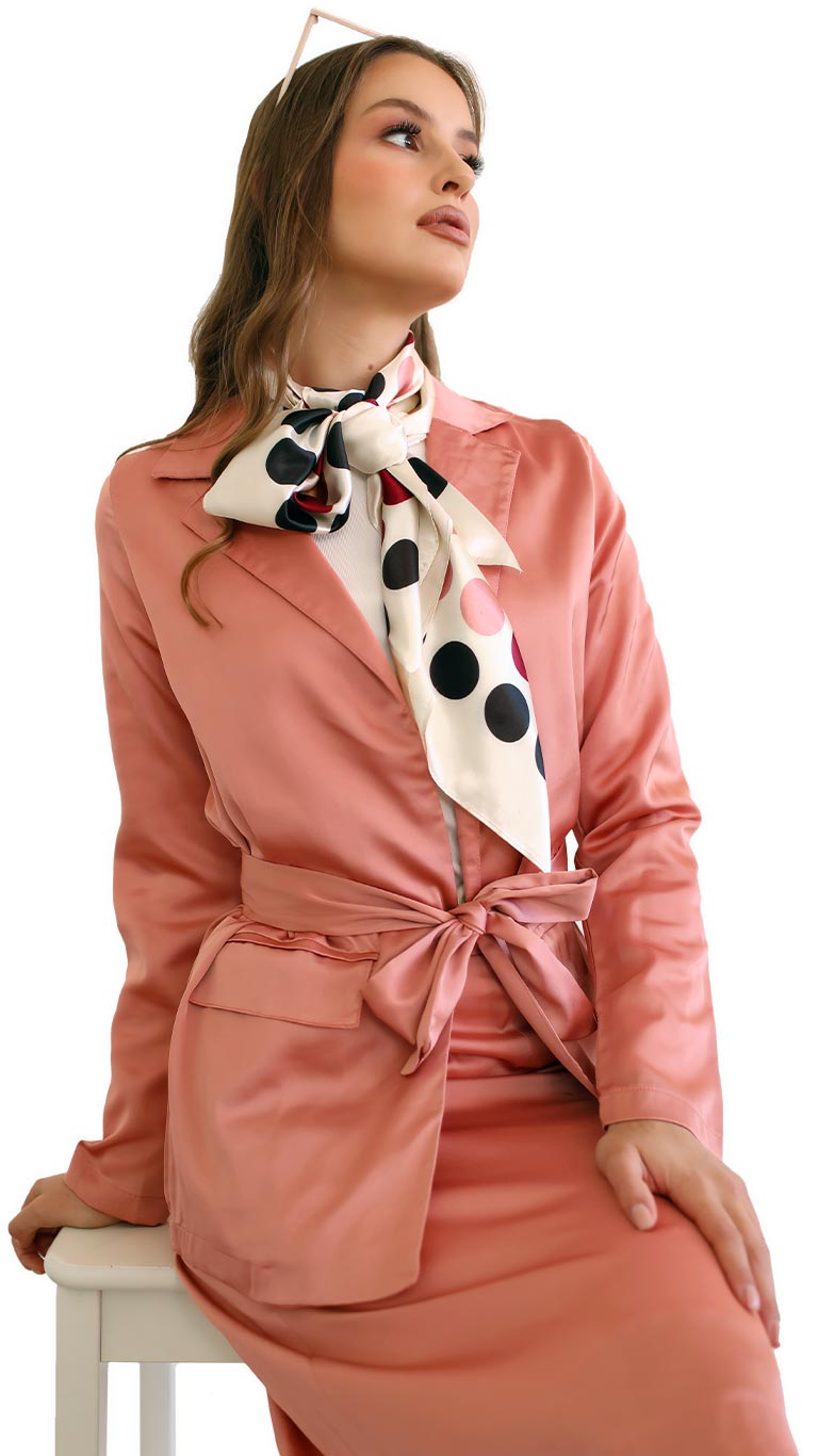 בד סאטן קליל ונוח, ז’קט בגזרת אוברסייז יוצרת מראה מחמיא.