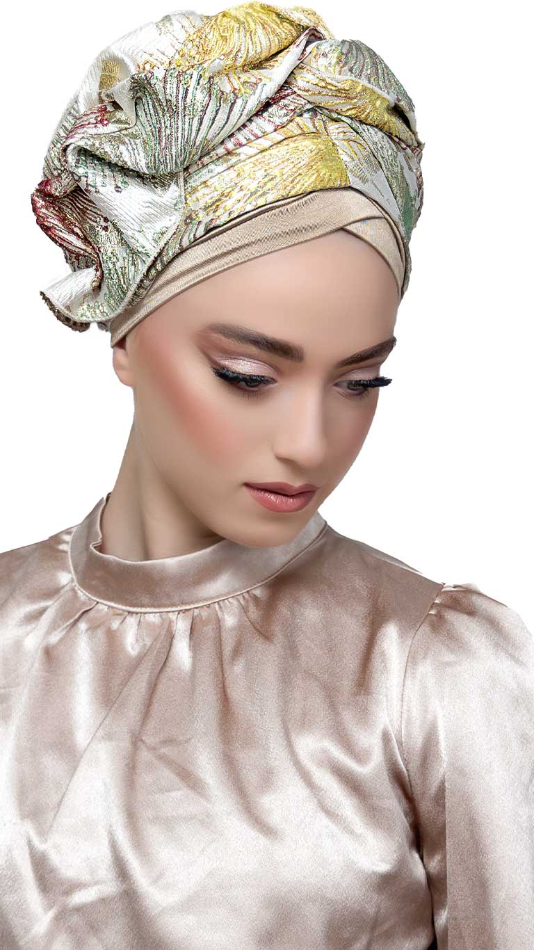 מטפחת עשויה בד ברוקד משגע בגוונים של זהב/ירוק/חמרה/חרדל